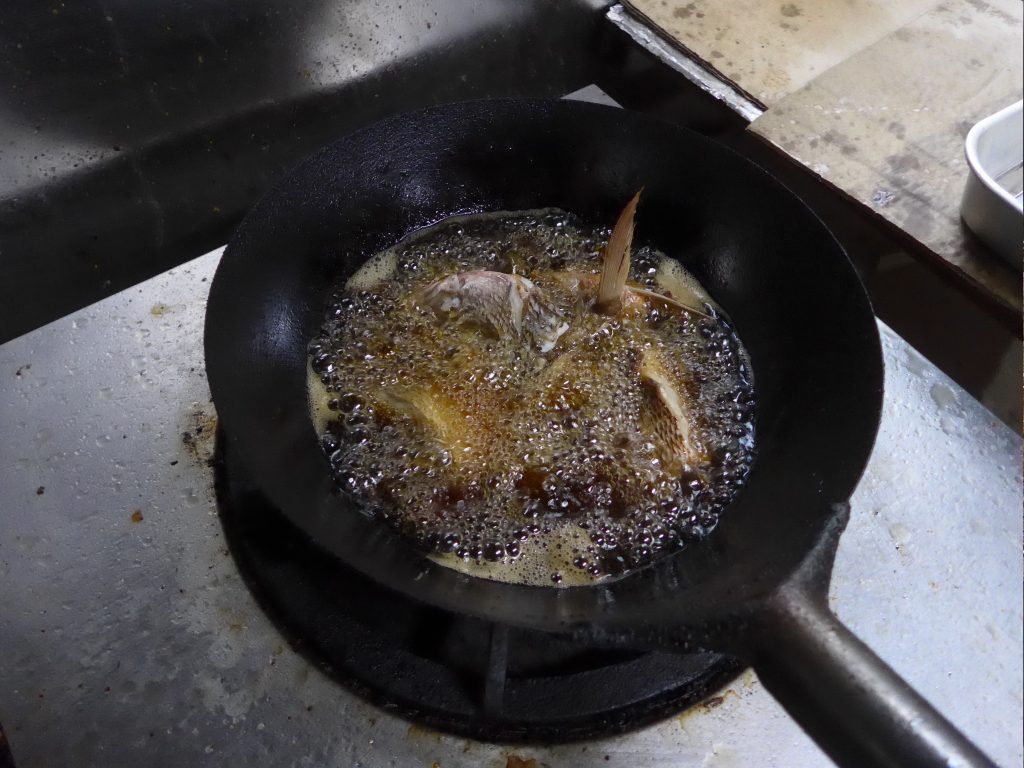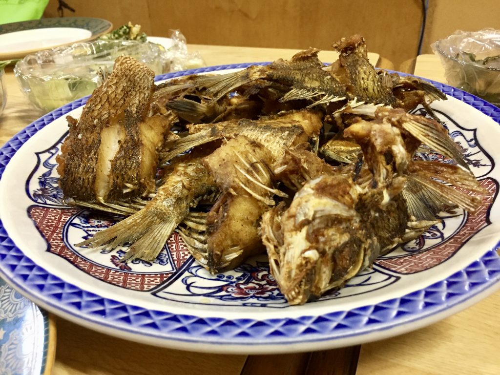 Although our host likes fishing and although it is around 23°C, he finds it too cold to go out fishing… instead we caught our own sea food with a trap and bate.