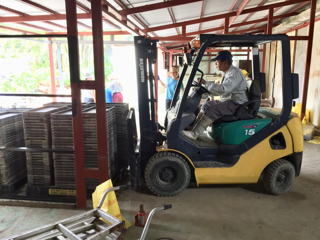 These are then stacked and left for 5-7 days to germinate and get a small size plant… which will then be laid out in a greenhouse for another ~2 weeks.