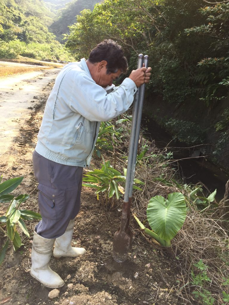Kazushige was using a special tool to make wholes for the plants.