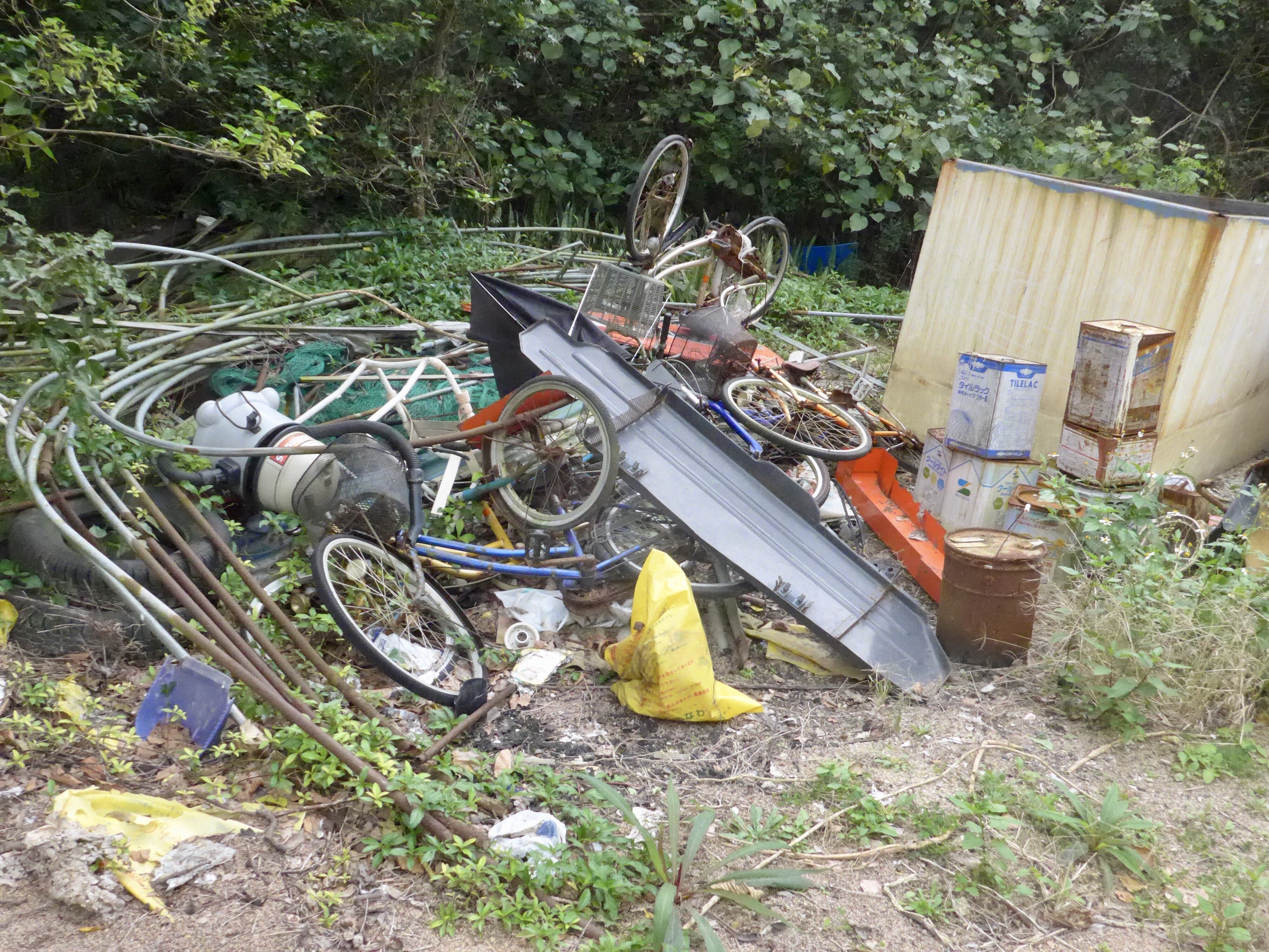 An abandoned road goes a long way up, we even get a nice view back on the rice fields and Kazushige still clearing the evacuation water canals…